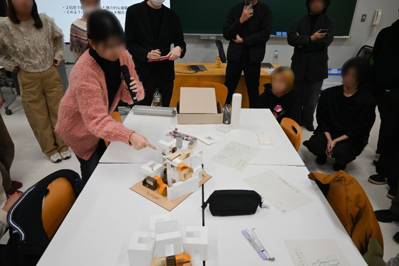 写真4 ワークショップの様子 つくられた建築を絵にかきコンセプトを明示